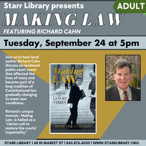 “Making Law,” local author talk with Richard Cahn, who discusses his memoir, including six dramatic Constitutional law cases. Register at Starrlibrary.org. At the library, Rhinebeck.