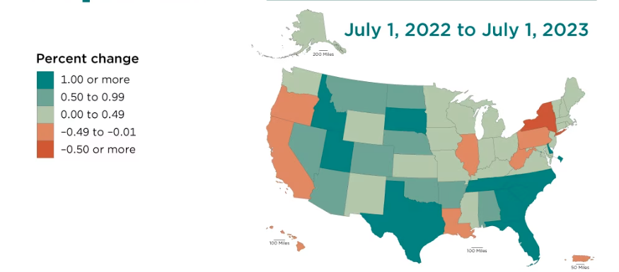 It's Up to You New York // In 2023, amid an overall rise in the U.S. population, New York State lost more residents than any other state, at the largest rate among the states, according to U.S. Census data. Just ahead of California, with an estimated overall loss of about 75,000 people, New York State experienced a net loss of 101,984 residents from July 2022 to July 2023, a 0.5% rate of population decline. Even the addition of 74,000 international arrivals to the state and the natural increase of more than 41,000 residents weren’t enough to offset the loss of almost 217,000 New Yorkers who fled the state between mid-2022 to mid-2023. The census also determines how many U.S. congressional seats each state is entitled to. At this rate of population decline, New York could lose three U.S. House seats by 2030. On the other hand, the census indicated that Texas and Florida continued to see the country’s highest population booms, adding more than 473,000 and 365,000 residents, respectively.