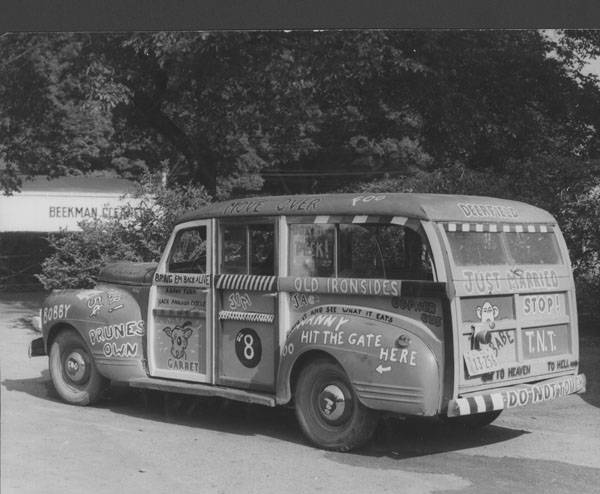Allan Ryan, proprietor of the famous Ankony Farm owned this woodie station wagon. The car was decorated for the Dutchess County Fair. The Ryan family of Ankony Farms showed Angus cattle, horses and dogs at the fair.