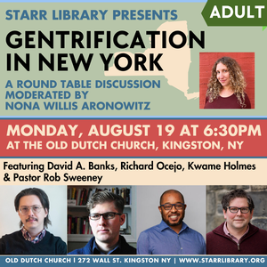 “Gentrification in New York,” a roundtable discussion moderated by Nona Willis Aronowitz, with David A. Banks, Kwame Holmes, Richard Ocejo, and Pastor Rob Sweeney. Presented by Starr Library. At Old Dutch Church, 272 Wall St., Kingston.