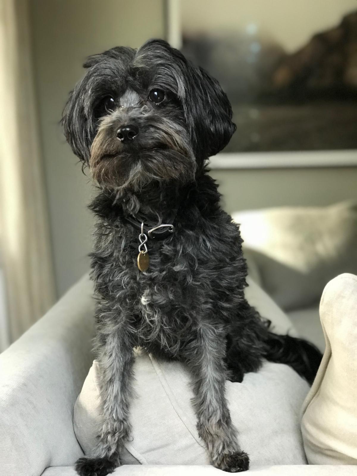 Truman is a poodle-mix rescue. He loves to look at squirrels and other dogs passing by from his perch outside his village window.
