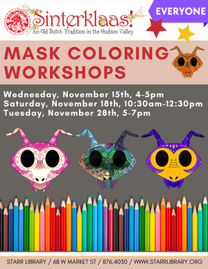 Sinterklaas Mask Coloring Workshops. For all ages. Bring your creativity! At Starr Library, 68 West Market St., Rhinebeck.