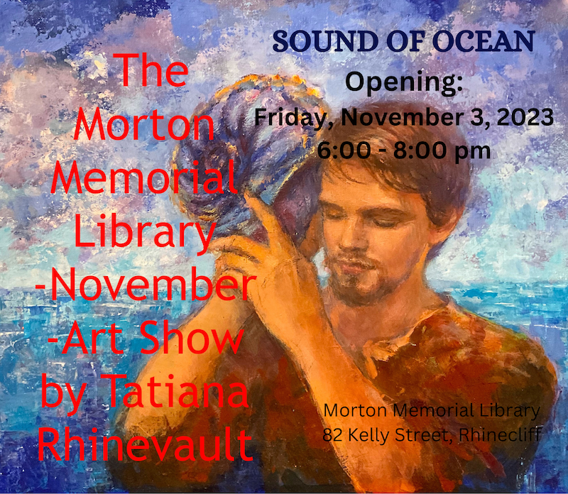 Exhibit of watercolor, acrylic, and oil paintings by Tatiana Rhinevault. At Morton Library, 82 Kelly St., Rhinecliff.