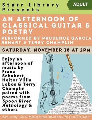 An Afternoon of Classical Guitar and Poetry with guitarist Terry Champlin and actress Prudence Garcia-Renart, with music by Schubert and Villa-Lobos and words from “Spoon River Anthology”, a work by Tennessee Williams, and others. At Starr Library, 68 West Market St., Rhinebeck.