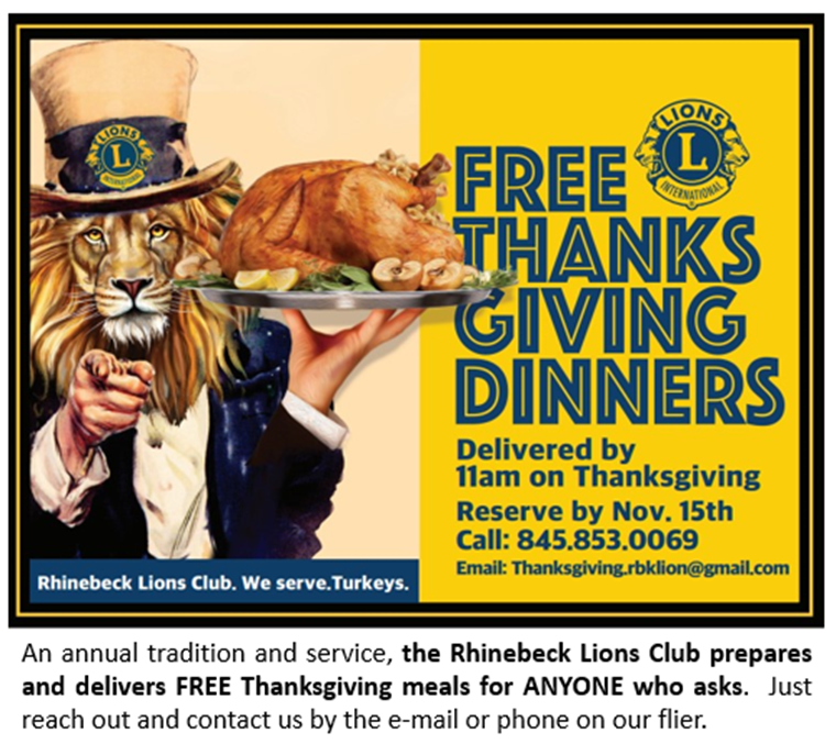 Thanksgiving meal delivered FREE to any member of the community who requests it. If you are interested in having a meal delivered, or in donating food or money, or can help with delivery, contact the Rhinebeck Lions Club at 845-853-0069 or thanksgiving.rbklion@gmail.com.