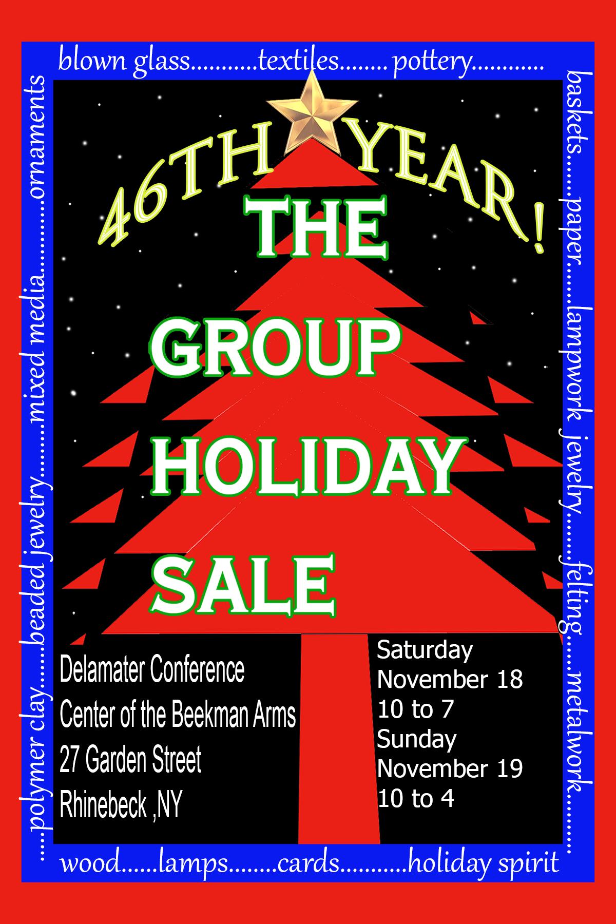 The Group Holiday Sale, “a gem of a craft show,” featuring 17 artisans, including blown glass, textiles, pottery, and more. At the Delamater Conference Center, steps from the Market St. intersection, enter off Rte. 9, Rhinebeck.