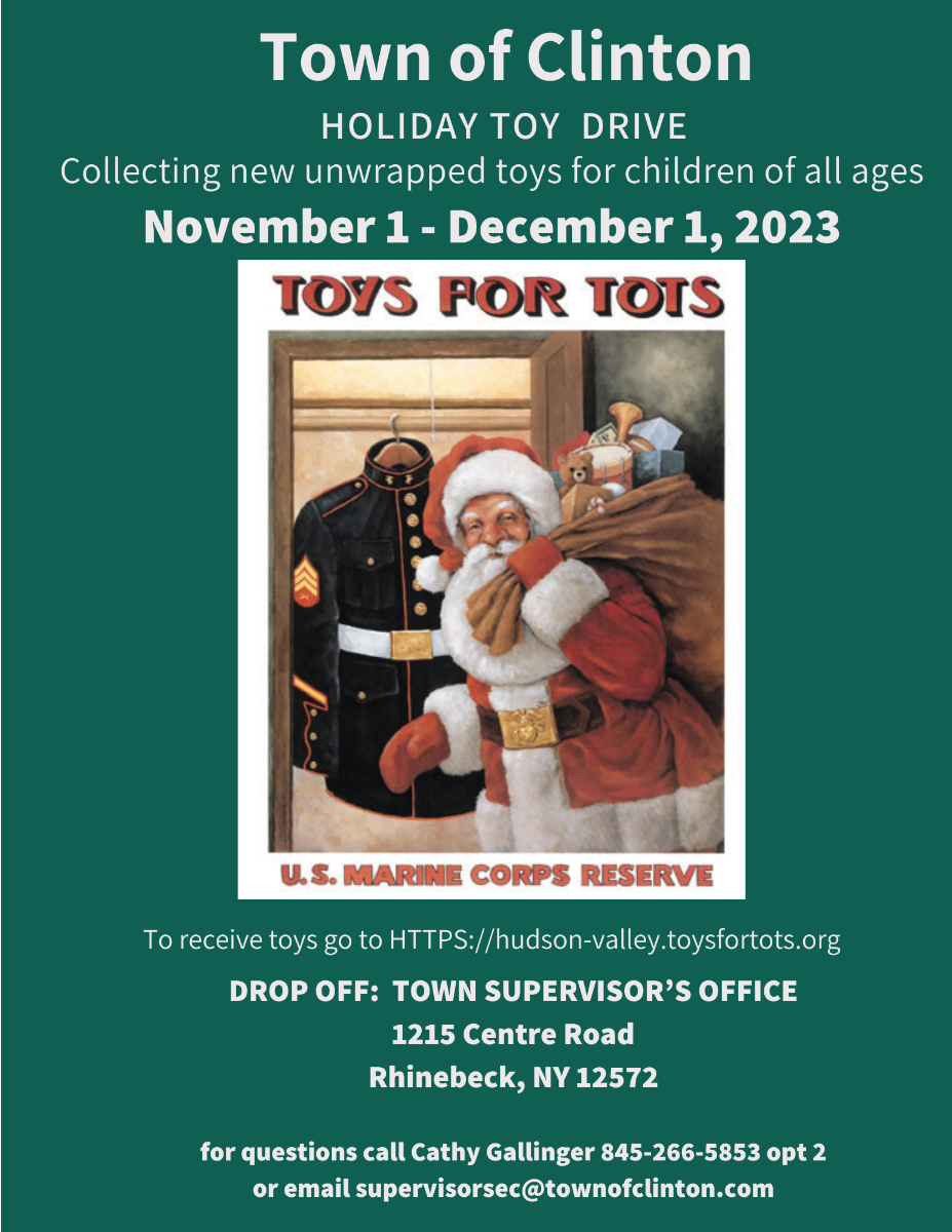 Town of Clinton Toys for Tots. Drop off new unwrapped toys for children of all ages at Town Supervisor’s Office, 1215 Centre St., Rhinebeck.