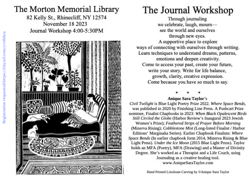 Journal Workshop with prize-winning poet Anique Taylor. At Morton Library, 82 Kelly St., Rhinecliff.