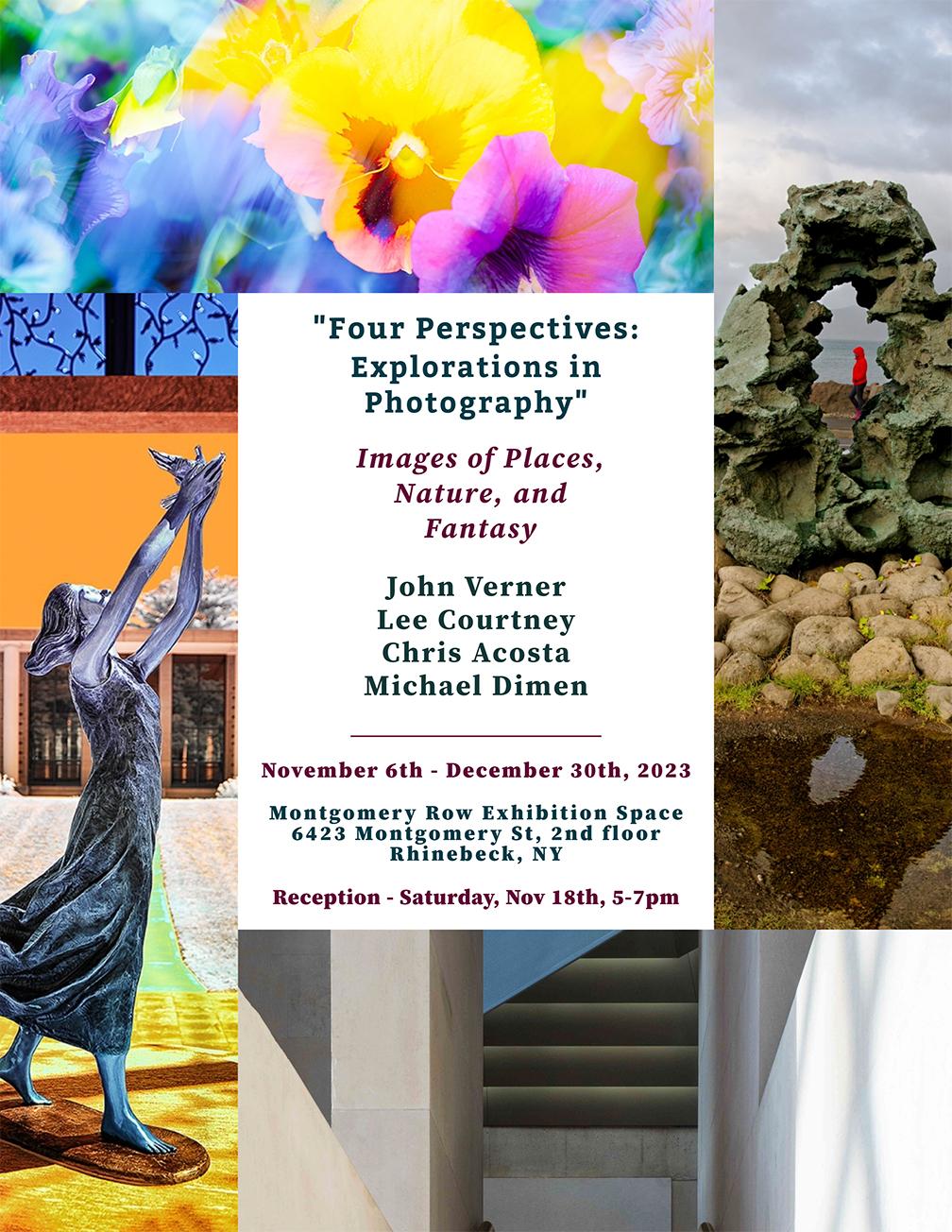 Opening reception for “Four Perspectives: Explorations in Photography,” presenting work by Chris Acosta, Lee Courtney, Michael Dimen, and John Verner. Exhibit runs through Dec. 30. At the Montgomery Row Art Exhibition Space, 2nd floor (elevator is available), 6422 Montgomery St. (Rte. 9), Rhinebeck.