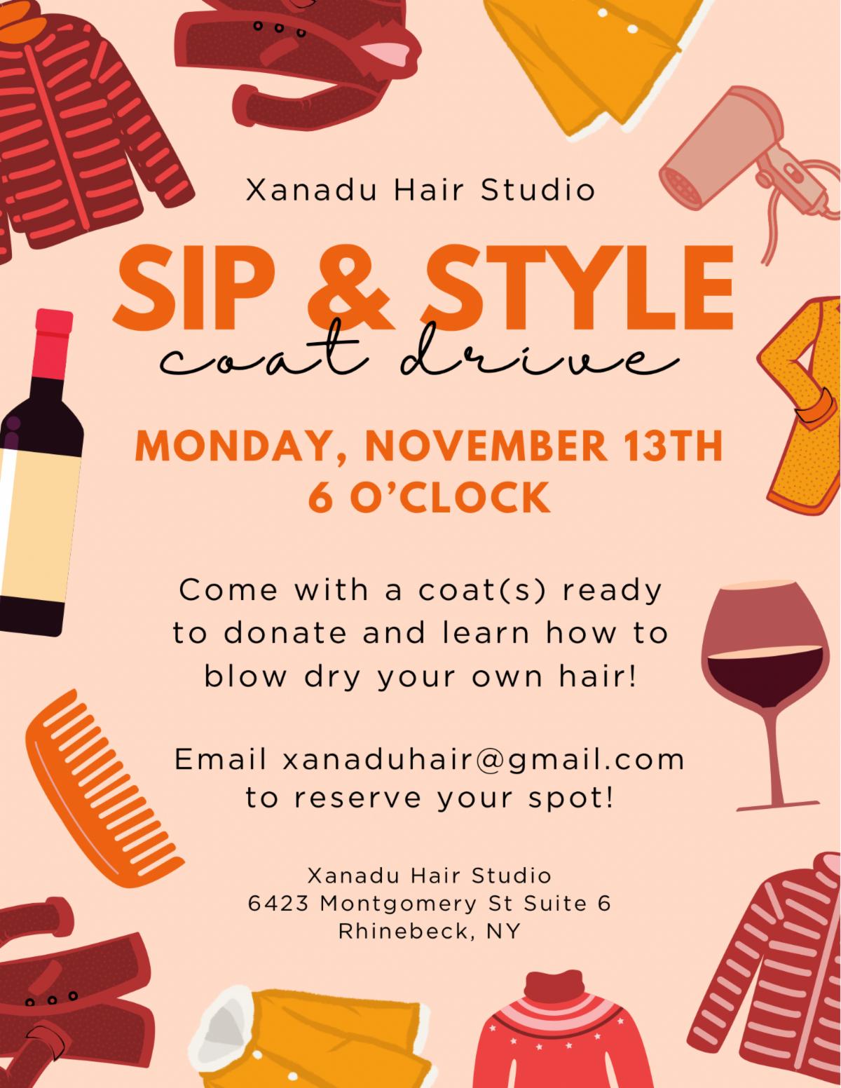 Sip & Style Coat Drive: Bring a coat ready to donate and learn how to blow-dry your own hair. Email xanaduhair@gmail.com to reserve your spot. At Xanadu Hair Studio, 6423 Montgomery St. (Rte. 9), Montgomery Row), off the rear parking lot.