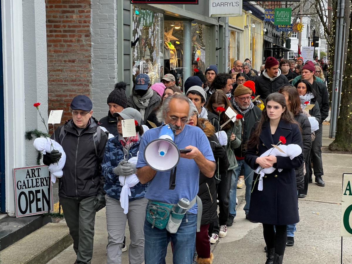 On Sunday, a group of about 100 gathered together to form a solemn community vigil that moved its way into the heart of the village of Rhinebeck to commemorate the many lives lost to the ongoing and tragic war between Israeli forces and Hamas.