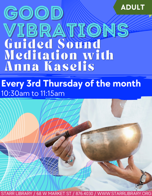 Good Vibrations; Guided Sound Meditation with Anna Karelis. “Clear your mind with us.” Register at Starrlibrary.org. At the library, 68 West Market St., Rhinebeck.