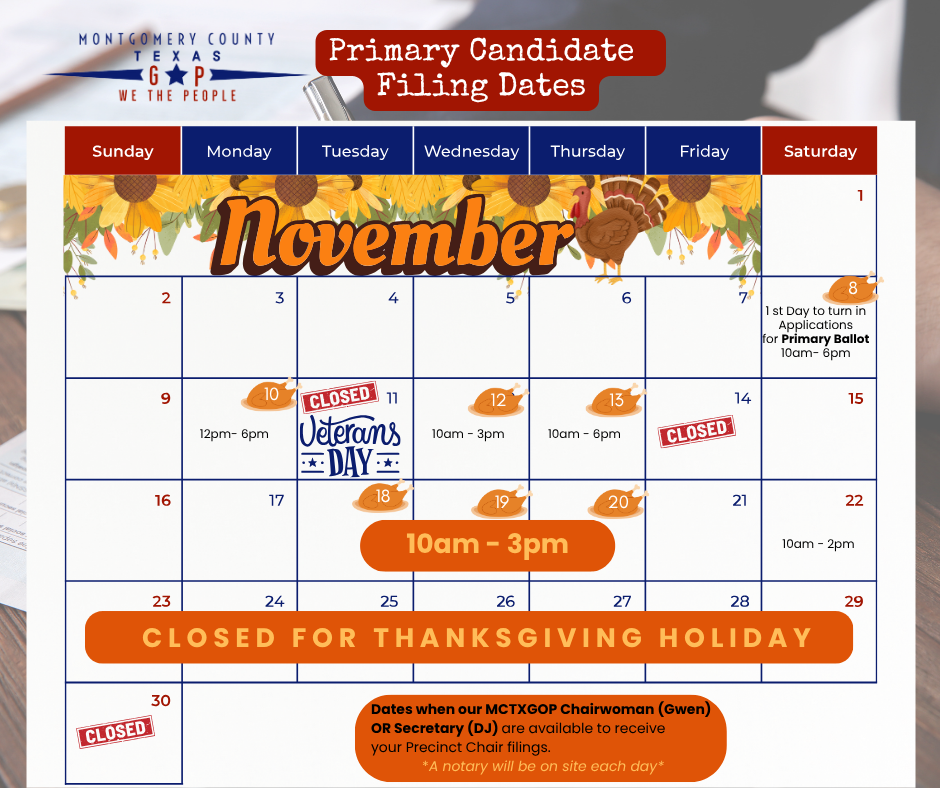 Please check the party website or call the headquarters for a schedule of dates and times we will be accepting applications through December 8, 2026. Office hours on Dec. 8 will be 10 AM - 6 PM.