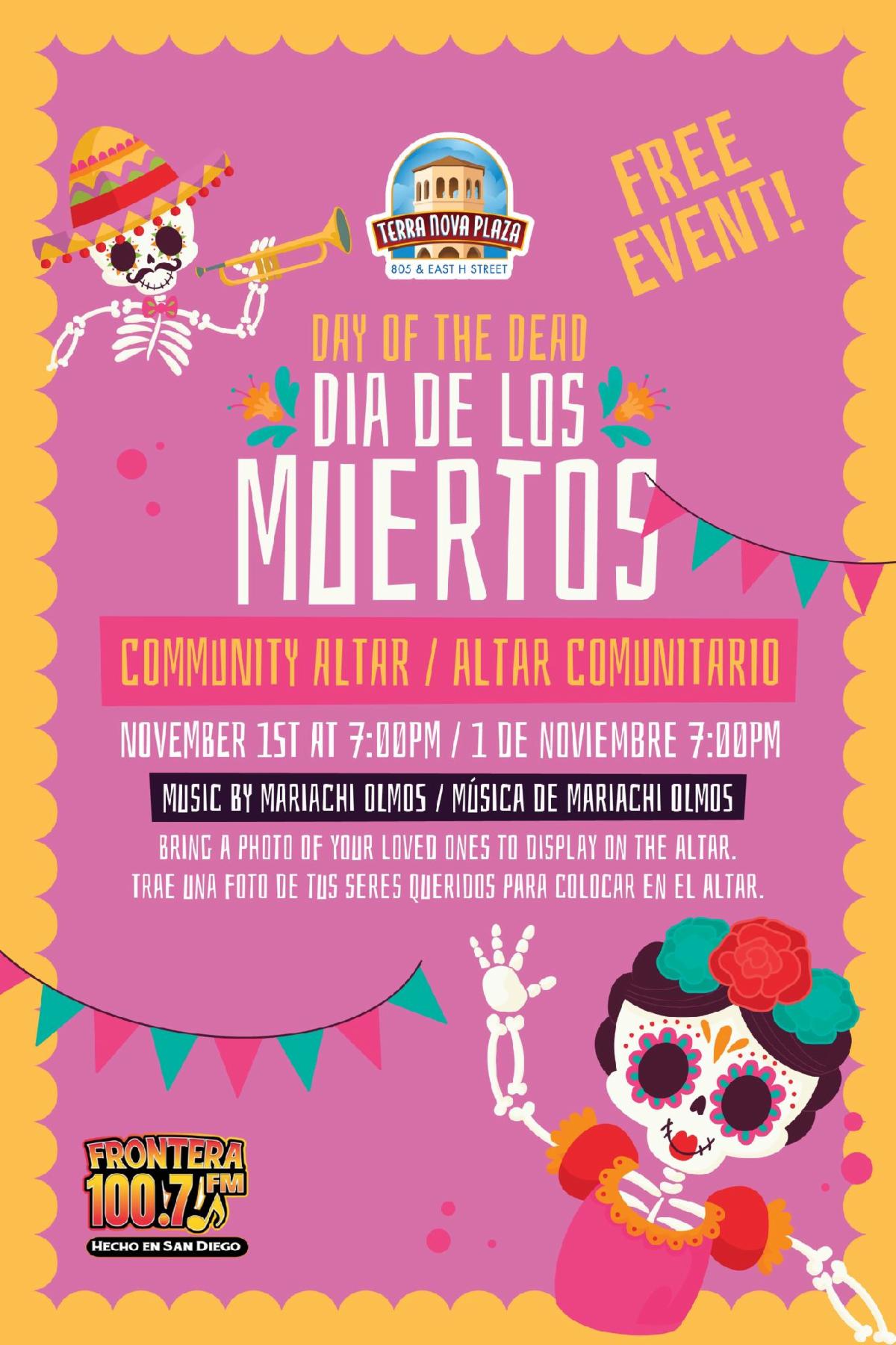 Bring a photo of your loved ones to display in this community altar at Terra Nova Plaza! On Saturday, November 1st at 7:00PM, enjoy this free event with music from Mariachi Olmos.