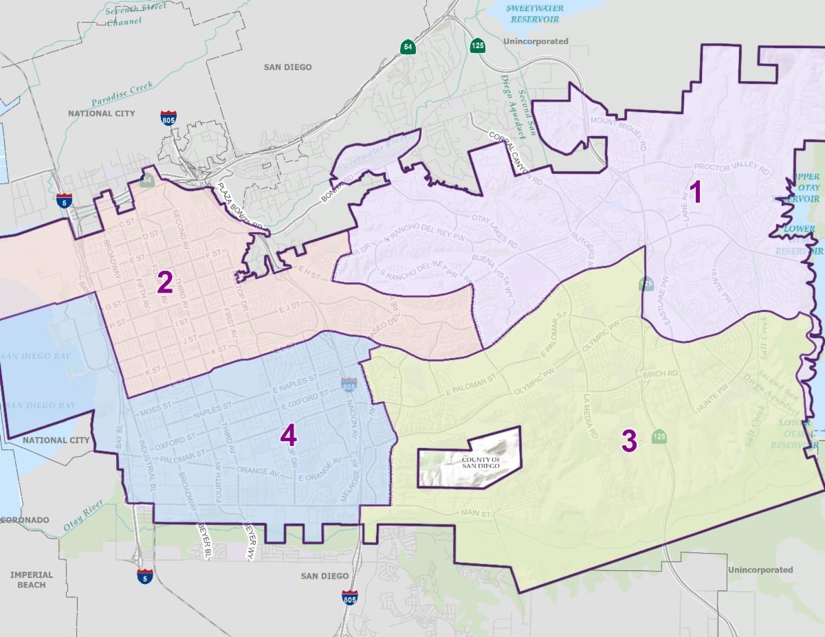 Chula Vista's District 2 sits North of L Street and West of Paseo del Rey.