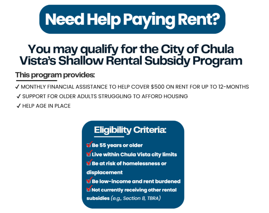 Eligible Chula Vista residents aged 55+ may qualify to receive a fixed monthly rental subsidy of $500 for up to 12 months to help offset high housing costs. The program is designed to provide some financial relief for households spending more than 50% of their income on rent. Priority will be given to extremely low-income seniors, especially those living alone or at risk of homelessness.