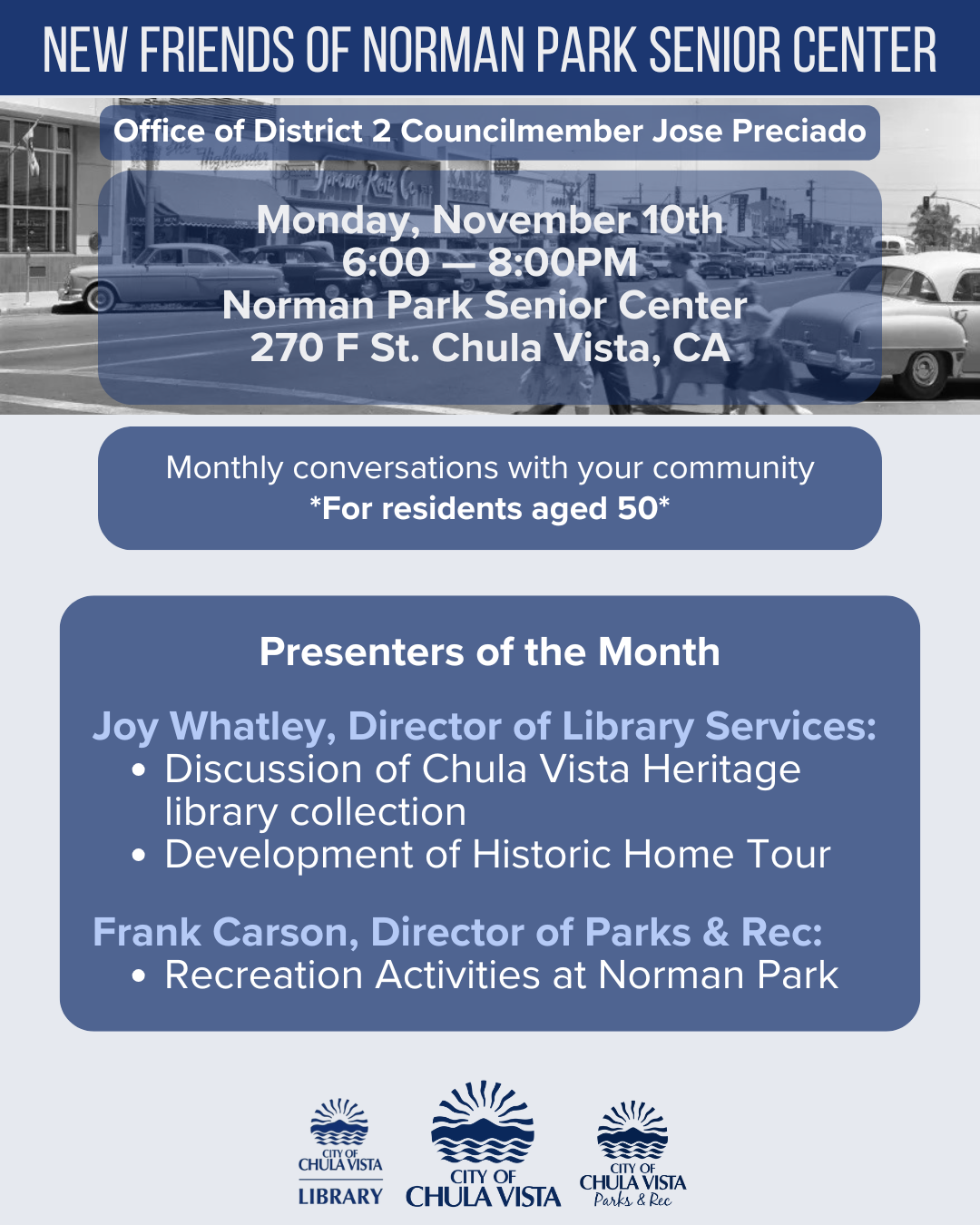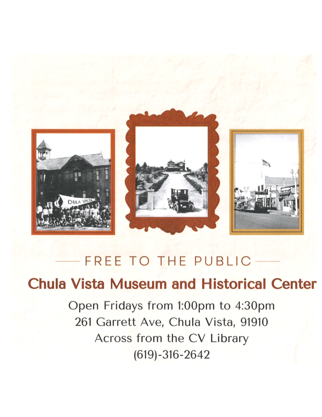 The November meeting will feature Joy Whatley, Director of Library Services, to discuss the library's collection of Chula Vista Heritage. We will also begin development of Historic Home Tours.