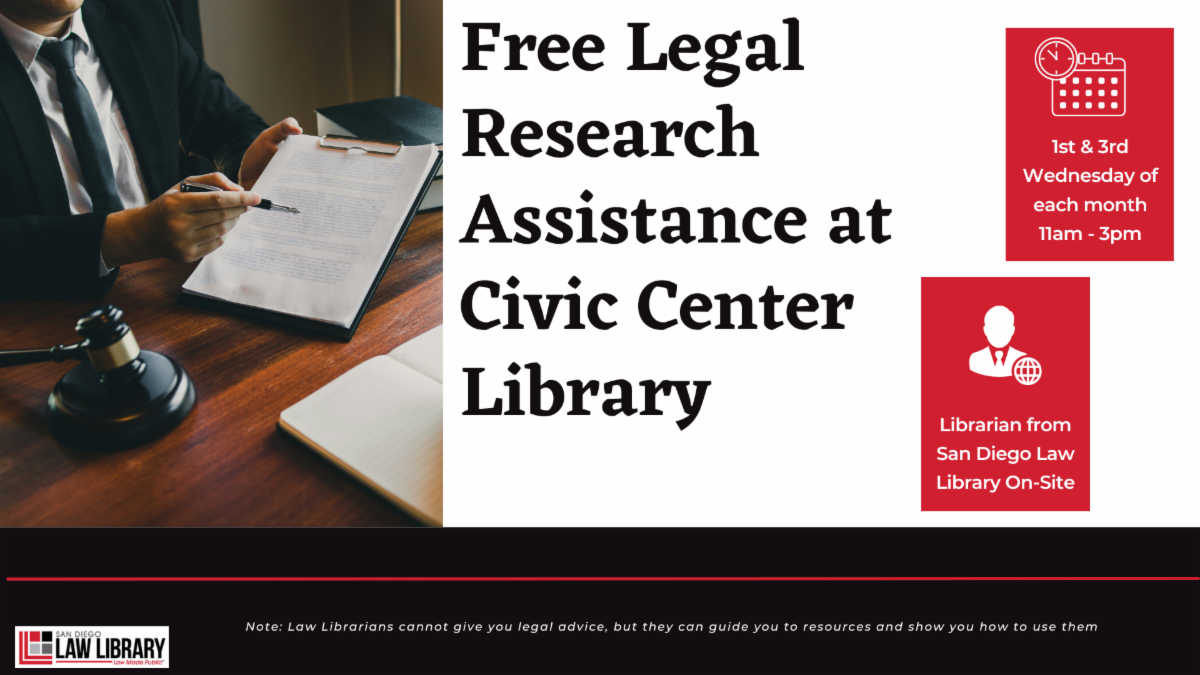 Did you know you can receive free legal research assistance from a San Diego Law Librarian here in Chula Vista? Visit the Civic Center Library every 1st and 3rd Wednesday of the month from 10AM-3PM to find resources for legal aid.
