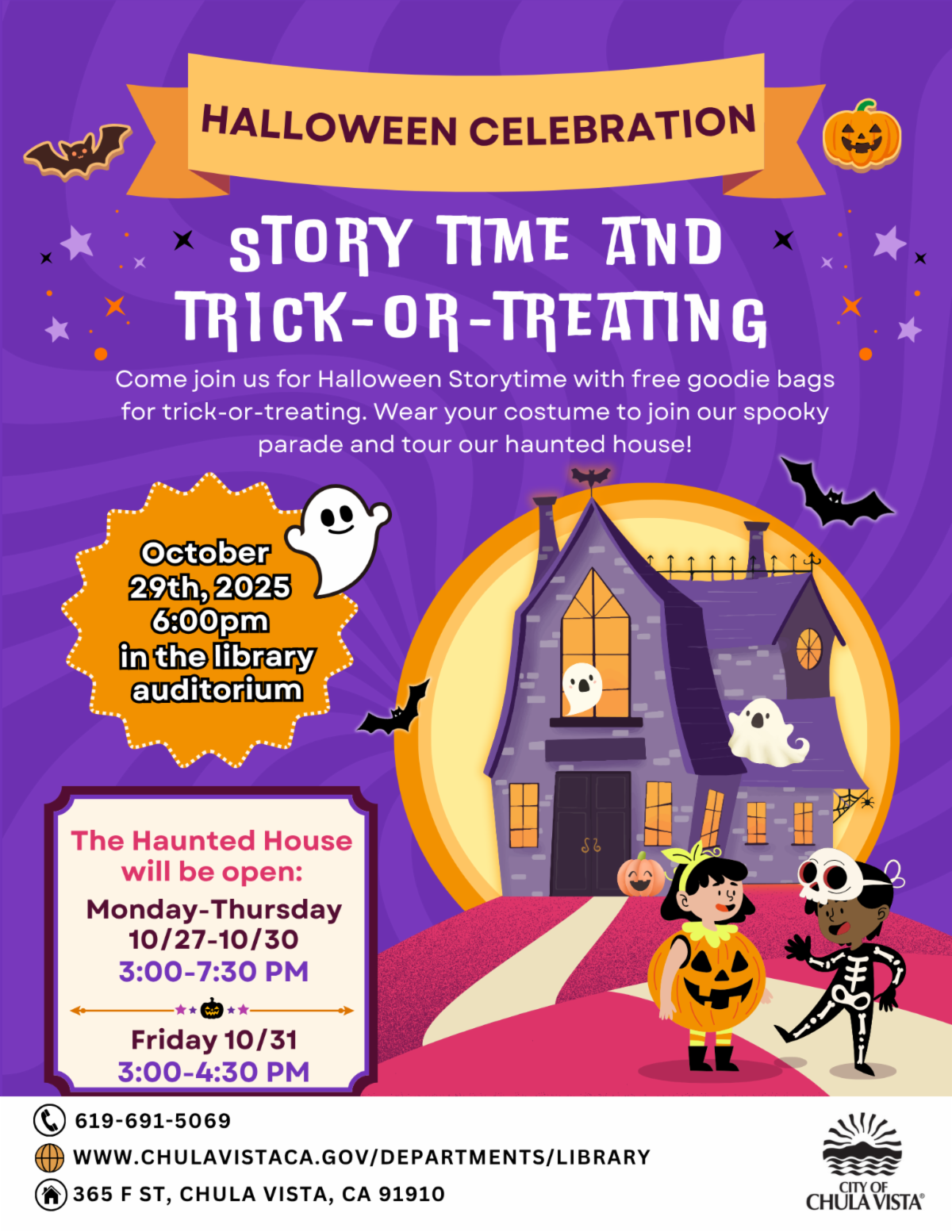The Civic Center Library is hosting a special spooky storytime with free goodie bags and a Haunted House tour on Wednesday, October 29th at 6:00PM! Wear your costume to join a spooky parade.