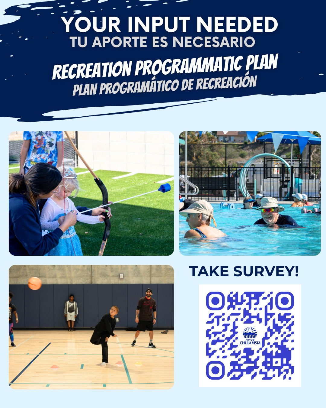 You can provide input online at https://publicinput.com/cvrecplan or in person—see Chula Vista calendar for dates & location.