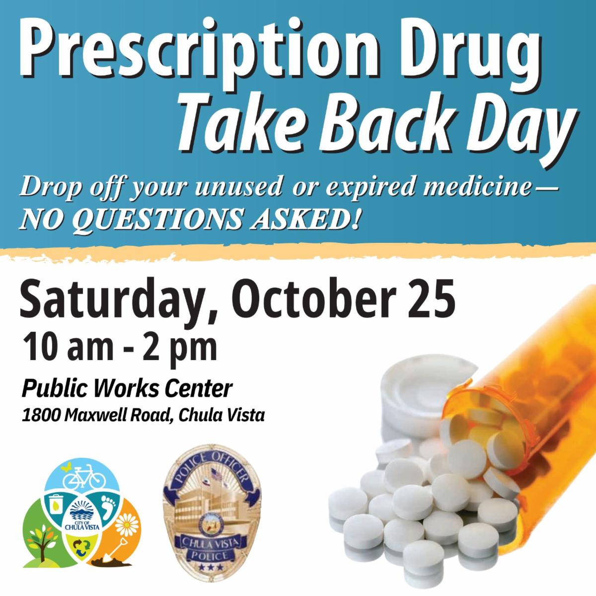 National Prescription Drug Takeback Day is Saturday, October 25th! Returning unwanted medicines to a take-back program is the safest and most environmentally protective way to dispose of unused prescriptions or over-the-counter drugs. Drop off your unused or expired medicine—NO QUESTIONS ASKED—at the Public Works Center, 1800 Maxwell Rd from 10:00AM-2:00PM.