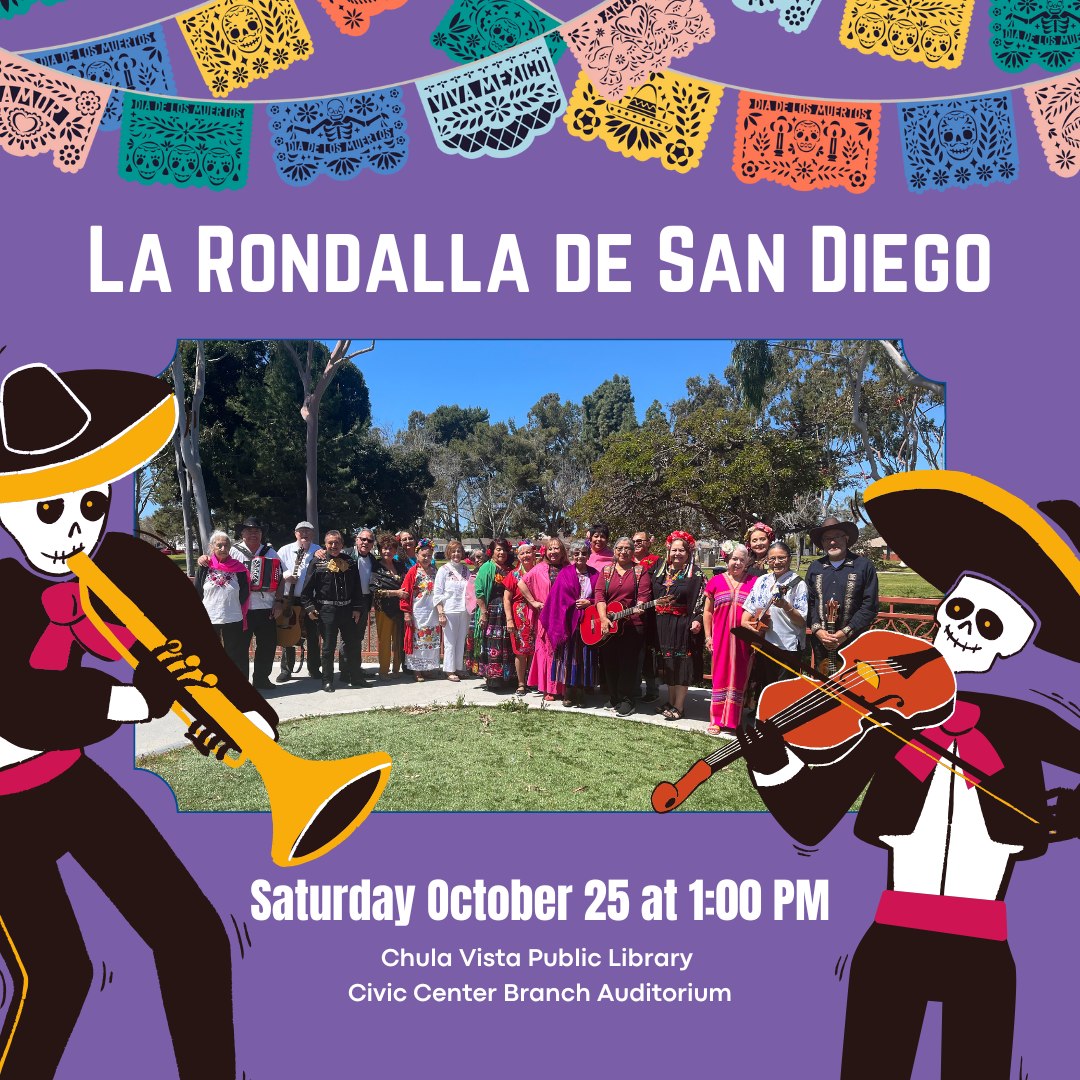 Gather your loved ones and come down to the Civic Center Library on Saturday, October 25th at 1:00PM for a free concert by La Rondalla de San Diego! Sing along to classic and traditional tunes celebrating Día de los Muertos.