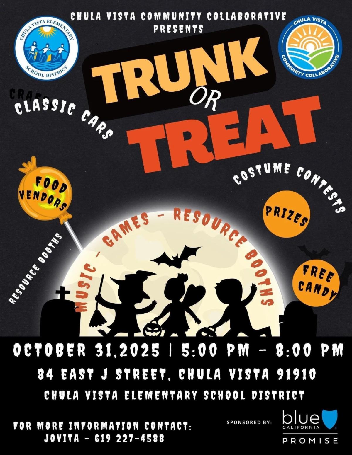 Enjoy sweets and spooky fun with Chula Vista Elementary School District's Trunk or Treat! Hosted by Chula Vista Community Collaborative, your family can celebrate Halloween with classic cars, free candy, costume contest, music, and games. Join the community at 84 East J St on Friday, October 31st from 5:00-8:00PM.