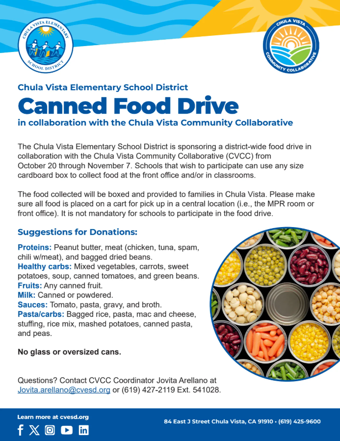 The Chula Vista Elementary School District (CVESD), in partnership with the Chula Vista Community Collaborative (CVCC), is hosting a district-wide food drive from October 20 through November 7, 2025.