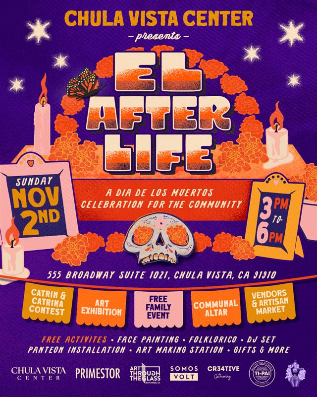 Step into El After Life—where tradition meets celebration. This Día de los Muertos, the Chula Vista Center honors the roots of this celebration while making art and culture accessible to the entire community, transforming the mall into a space where memories are shared, traditions are alive, and everyone feels connected. Come down on Sunday, November 2nd from 3:00 to 6:00PM at the Chula Vista Center, between Macy's & Burlington.
