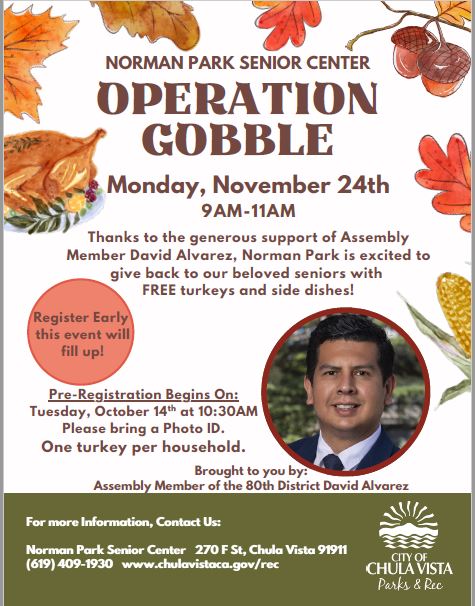 Assemblymember David Alvarez is bringing Operation Gobble to Norman Park Senior Center for another year! Seniors: register ASAP to receive your FREE turkey and side dishes at this special event—bring your picture ID to 270 F St to secure your spot.