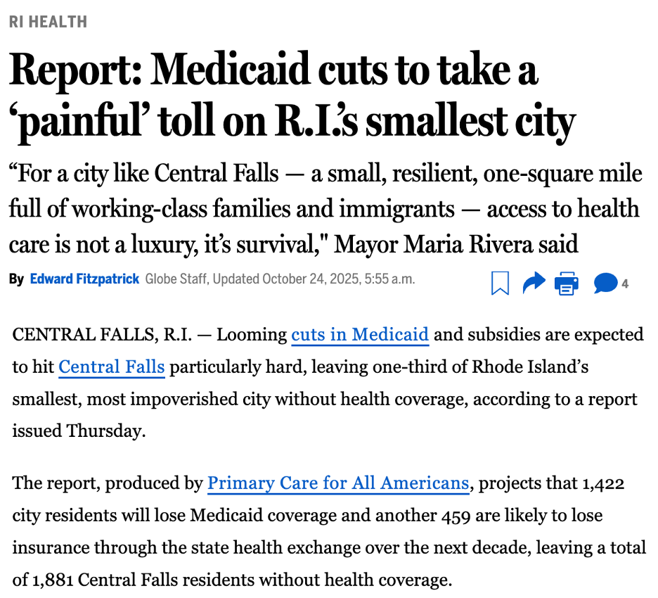 A recent report from the PC4AA Central Falls working group illustrates this looming disaster. Upcoming cuts to Medicaid and reductions in subsidies will have a devastating impact on Central Falls, RI., one of the state’s poorest and most densely populated cities. 1,422 residents will lose Medicaid coverage, and another 459 will lose insurance through the state exchange over the next decade. This is on top of an estimated 5,000–10,000 undocumented residents who already lack coverage.