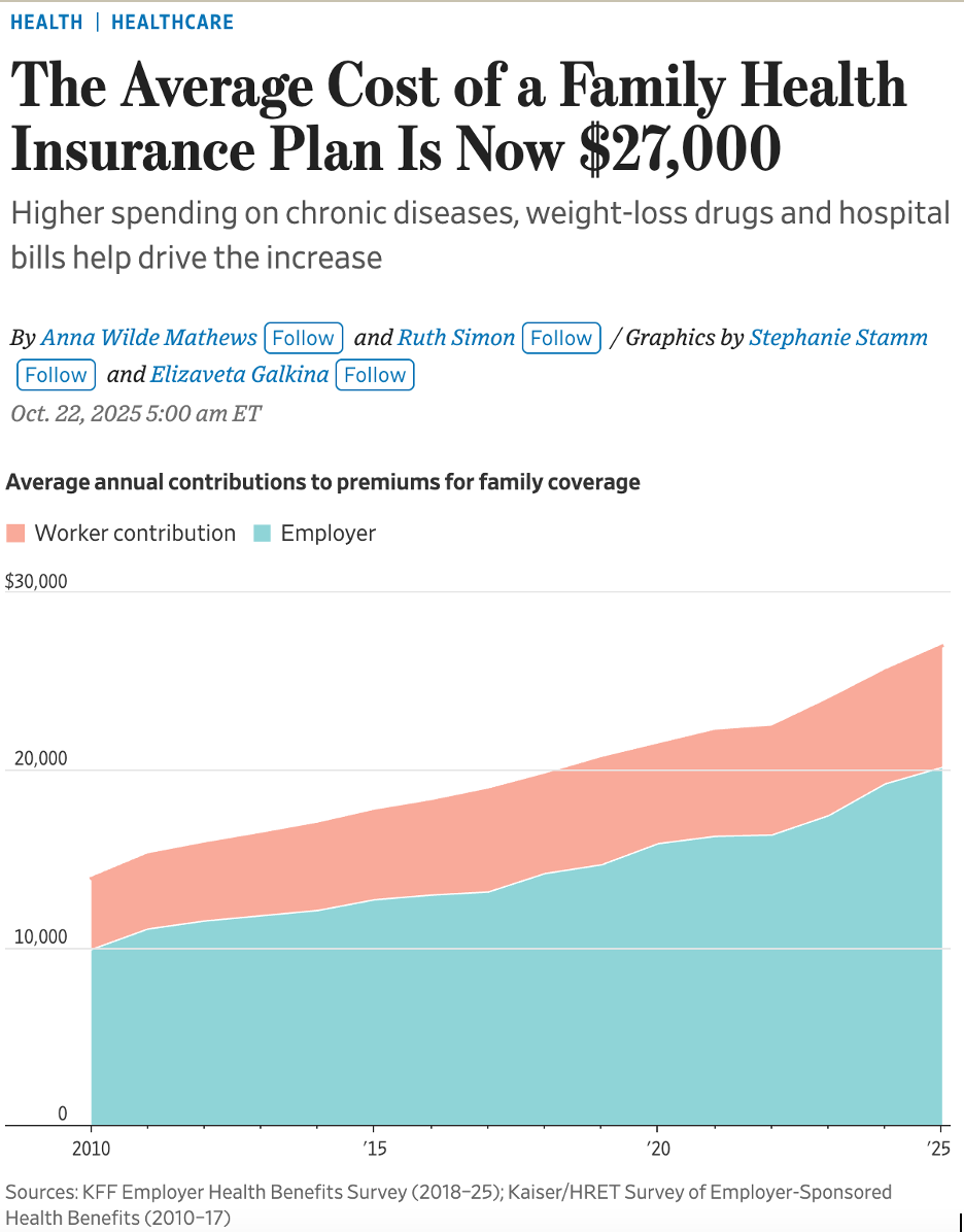 Meanwhile, a parallel crisis is occurring in the private sector. The cost of employer-sponsored health insurance rose for a third consecutive year in 2025, reaching nearly $27,000 for a family plan, according to a Kaiser Family Foundation (KFF) study covered in the Wall Street Journal. Premiums are rising faster than inflation. Rising costs are driven by higher overall healthcare spending, increasing hospital prices, more illness among working-age adults, and expensive new treatments. Small businesses are struggling; shifting costs to workers (higher premiums and deductibles), narrowing benefits, or dropping coverage entirely.