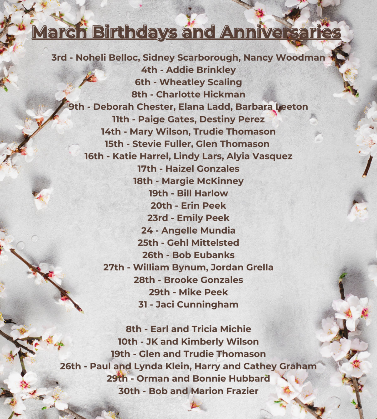 Jay Bates, Ruben Gomez, Fred Newman, “Patrick & Elizabeth Peek”, “Bonnie & Ormand Hubbard”, Helen, Betty Tull, Chas Howbert, Candice Escamilla, Ruben Aguirre, Beth Rubin, Karen and Al Telck, Suzanne Mitchell, “Lynda and Paul Klein”, Darryl, Scott Martin, Kristen Wilkinson, “Terry & Austin Owens,” Betty Rae, “Rachelle and Dusty Taylor”, Kati Lewis, Trey