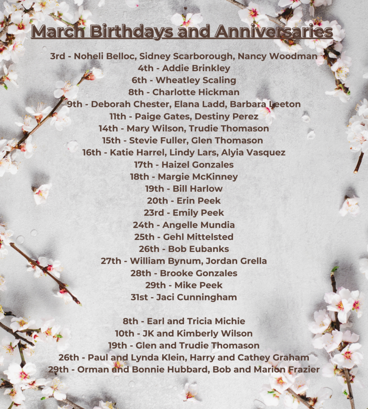 Jay Bates, Ruben Gomez, Fred Newman, “Patrick & Elizabeth Peek”, “Bonnie & Orman Hubbard”, Helen, Betty Tull, Chas Howbert, Candice Escamilla, Ruben Aguirre, Beth Rubin, “Karen and Al Telck”, Suzanne Mitchell, “Lynda and Paul Klein”, Darryl, Scott Martin, Kristen Wilkinson, “Terry & Austin Owens,” Betty Rae, “Rachelle and Dusty Taylor”, Martin Stapleton, Katie Lewis, Trey, Lynn Conine, Cindy Oglesby