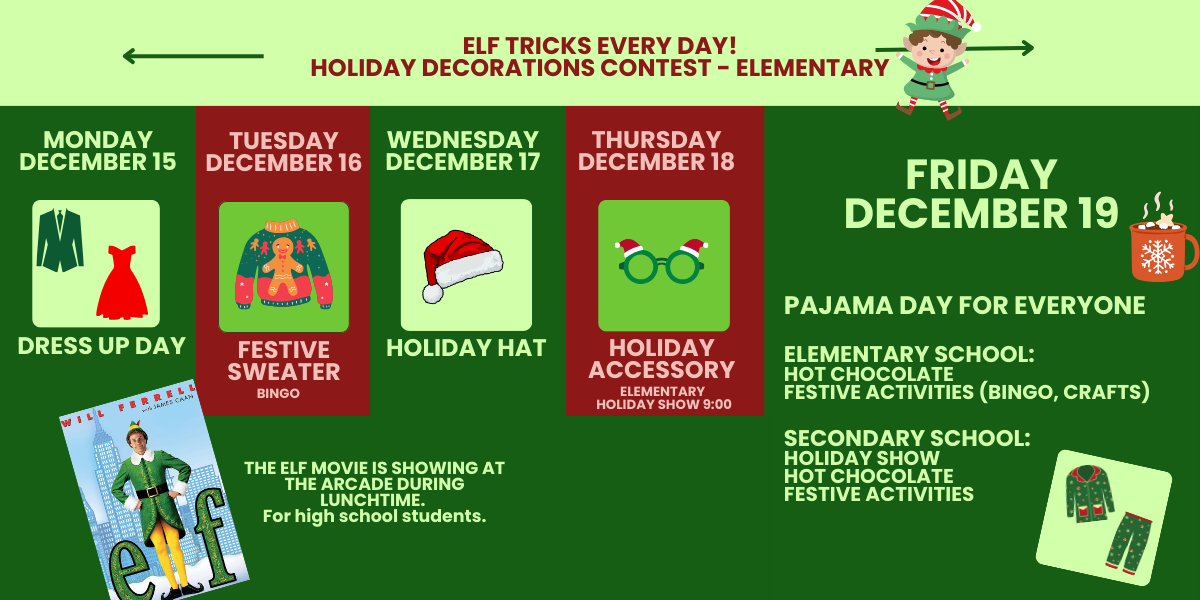 We would like to draw your attention to December 19, which is marked on our school calendar. Although the day is intended to be festive and devoted to more fun activities, please note that the regular schedule will remain in effect, given that we share school transportation with many other schools and school service centres. We will, nevertheless, do our best to make this a colourful day for everyone.