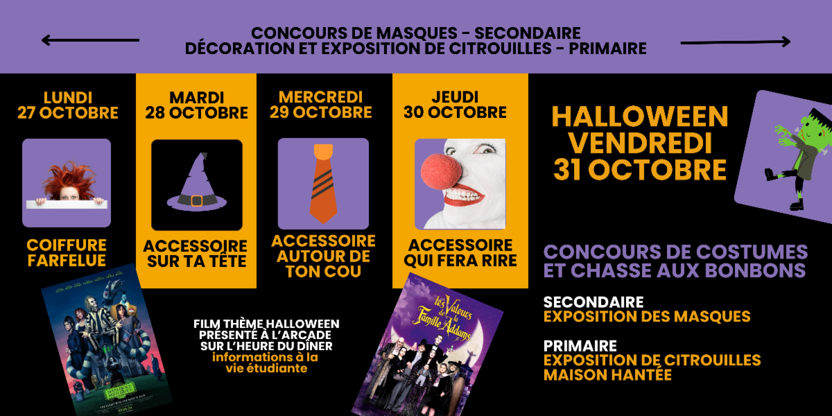 Une variété d'activités est prévue pour permettre à votre enfant de s'amuser durant la semaine d'halloween: création de masques, distribution et chasse aux bonbons, concours de constumes, etc. Nous avons hâte!
