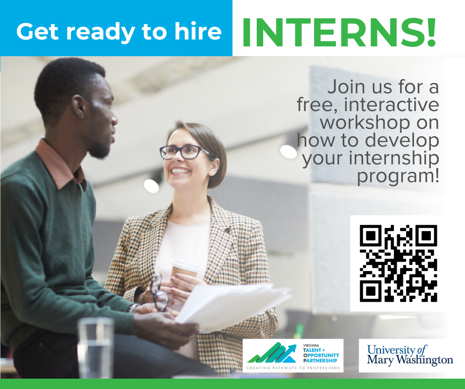 The Virginia Talent + Opportunity Partnership (V-TOP) is a workforce development accelerator that provides students and businesses with resources to optimize the mutual benefits of work-based learning. Our regional V-TOP representative, the Rappahannock Work and Learn Collaborative, is offering a free workshop designed to help organizations learn how to develop high-quality, mutually beneficial internship experiences, satisfy the training prerequisite to qualify for state-funded support (50% funding match and/or staffing agency services) for creating or expanding an internship program, and network with other local employers.