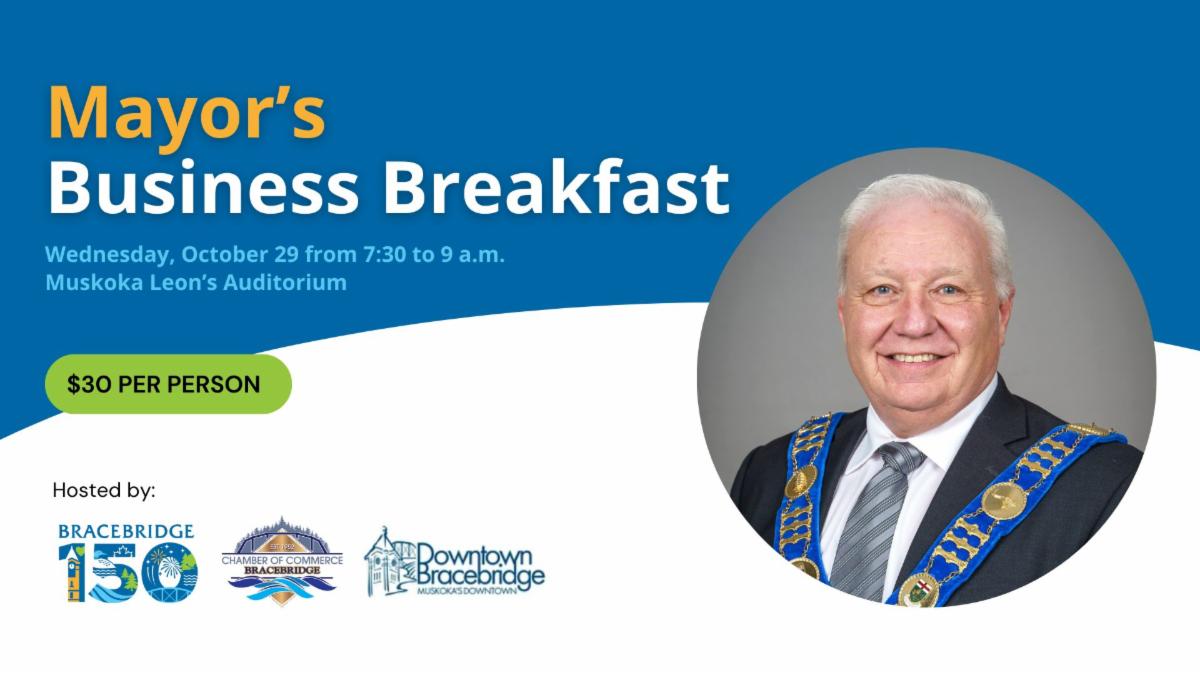 Members of Bracebridge’s business community are invited to join Mayor Maloney at the Mayor’s Business Breakfast on Wednesday, October 29 in the Muskoka Leon’s Auditorium.