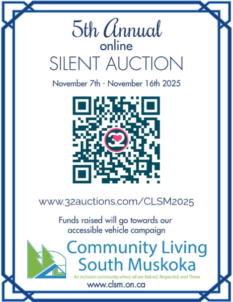 Community Living South Muskoka is excited to host their 5th annual Silent Auction from Friday November 7th - Sunday November 16th 2025! The funds raised will go towards purchasing a new accessible vehicle as well as help support the 450+ people in South Muskoka who have a developmental disability that are living below poverty to overcome challenges with food and housing security.